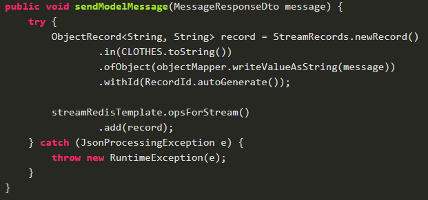 Stream에 데이터를 입력하는 Publisher는 다음과 같다. Stream은 Record 형태로 데이터를 저장하기 때문에 ObjectRecord의 제네릭 타입에 원하는 객체 타입을 명시한다. 키 중복을 막기 위해서 RecordId는 자동 생성 방식을 권장한다.