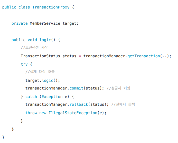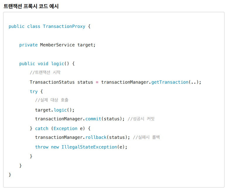프록시 코드는 서비스 코드를 target으로 가지고 클라는 프록시를 호출하면 트랜잭션을 시작하고 실제 대상을 호출하고 성공하면 커밋, 실패하면 롤백합니다.
