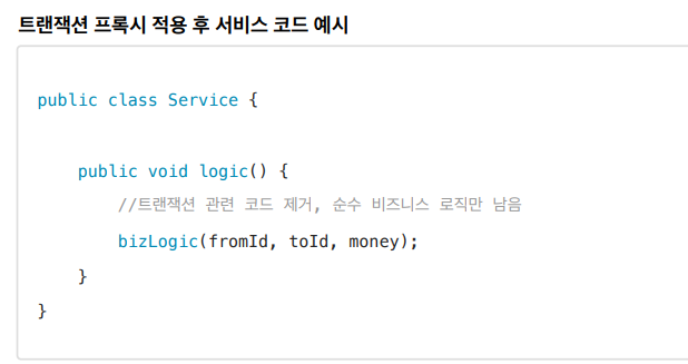> 프록시가 관리 로직을 모두 가져가고 트랜잭션 시작 후 실제 서비스를 대신 호출해줘서 덕분에 서비스에는 순수한 비즈니스 로직만 남습니다.
