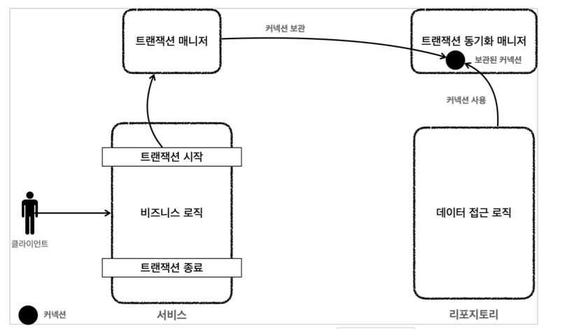 > 그냥 데이터를 안전하게 보관해줘서 멀티 스레드에서 안전하게 보관할 수 있다고 생각하면 됩니다. 이렇게 하여 커낵션을 파라미터로 넣을 필요 없고 트랜잭션 매니저가 커낵션을 만들고 동기화 매니저에 보관하고 레포가 예전처럼 파라미터가 아닌 동기화 매니저를 통해서 꺼내씁니다.