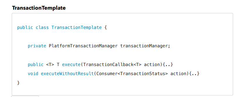 > execute를 하면 이 코드 안에서 트랜잭션을 시작하고 로직을 하고 로직이 끝났을 때 성공하면 커밋하고 예외가 터지면 롤백합니다. 탬플릿 덕분에 트랜잭션을 시작하고 커밋 롤백하는 코드가 다 제거됩니다.