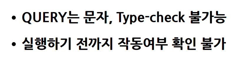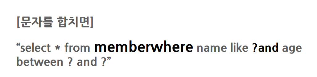 그런데 버그가 발생했습니다. 문자를 합쳐보면 member 뒤에 띄어쓰기가 없어서 memberwhere가 됩니다. 퀴리는 문자라서 실행해보기 전까지 작동 여부를 확인하기 어렵다는 문제가 있습니다. 컴파일 시점에 에러가 발생하지 않아서 고객이 사용하는 실행하기 전에는 절대로 알 수 없습니다. 만약 이 쿼리가 컴파일 시점에 오류가 터졌으면 바로 잡았을 것입니다.