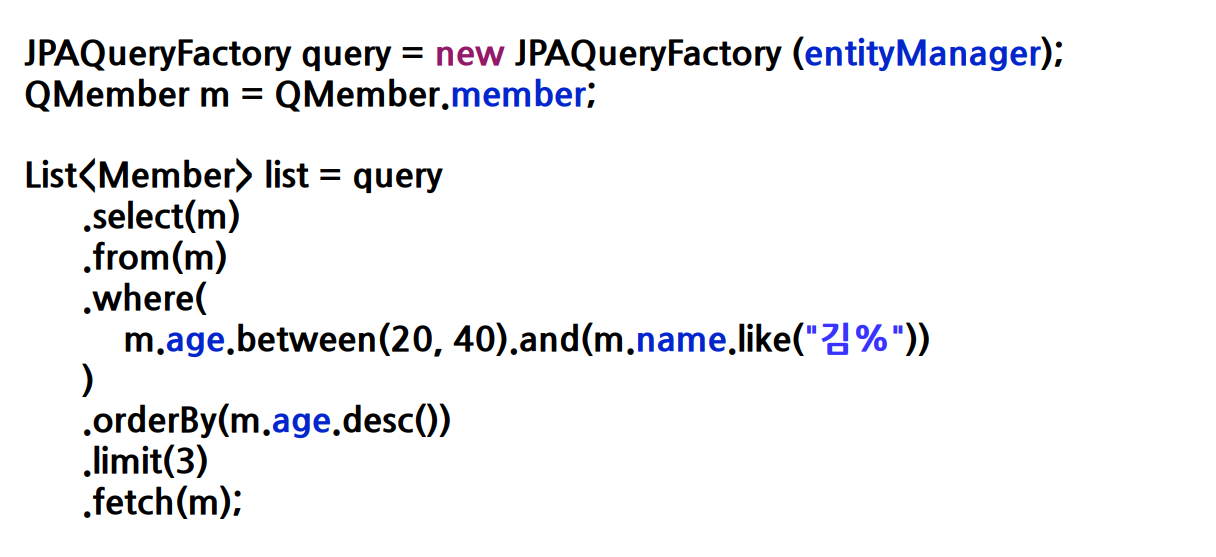 쿼리.select.from.where가 되고 m.age.between(20, 40)이 되고 .like 이러넥 됩니다. 쿼리를 자바 코드로 작성할 수 있게 됩니다. 이것으로 jpql이 만들어집니다.