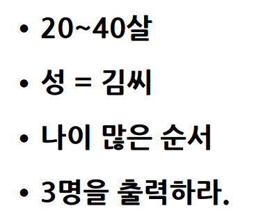 20 ~ 40세, 김씨, 나이 많은 순서, 3명 출력 조건이 있습니다. 테이블과 엔터티가 이렇게 있으면 jpa에서 쿼리 하는 방법은 3가지가 있습니다.