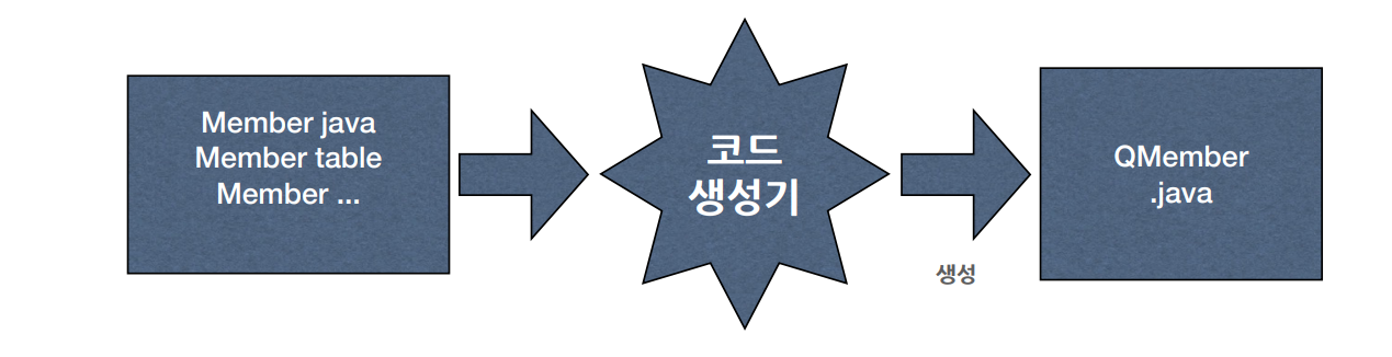 그러면 QueryDSL를 하려면 코드가 필요한데 테이블이나 엔터티에서 정보를 뽑아내서 코드 생성기가 돌아서 qmember인 쿼리용 멤버 객체를 만들어 줍니다. 코드 생성기인 Annotaion Processing Tool이라는게 있어서 이게 JPA 엔터티 코드를 읽어서 q 멤버를 만듭니다. 상품 엔터티면 qitem 객체를 만들고 그걸 가지고 쿼리를 자바 코드로 작성할 수 있게 합니다.