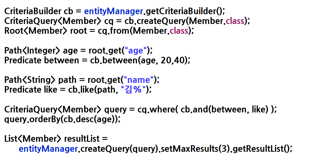 그래서 jpa에서 criteria를 제공하며 자바 코드로 쿼리를 작성할 수 있게 됩니다. 근데 코드가 너무 길고 복잡합니다. 또한 age, name이 type-safe하지 않습니다.