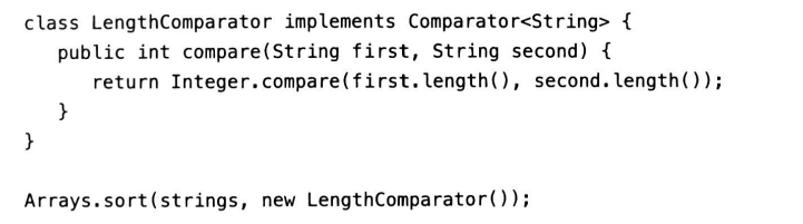 앞에서 본 예제에서는 한 문자열이 다른 문자열보다 짧은지 여부를 검사하는(compare) 코드를 전달합니다. 이를 람다로 표현해보면 (파라미터, ->, 원하는 코드) 형태를 가집니다.